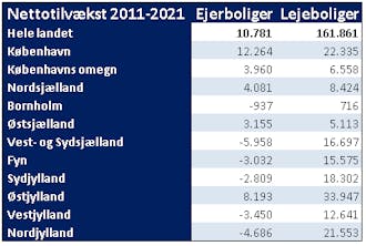 Ifølge Danmarks Statistik er 48,8 pct. af landets beboede ejendomme i 2021 beboet af ejeren selv. Modsat bebos 51,2 pct. af en lejer. Dermed er situationen vippet siden 2011, hvor 51,6 pct. af boligerne var optaget af boligens ejer. I den ti-årige periode er der netto kommet 10.781 flere ejerboliger i Danmark og ikke mindre end 161.861 flere lejeboliger. Tallene dækker over, at der i samme periode er nedrevet et stort antal ejerboliger og afspejler således ikke den samlede byggeaktivitet.