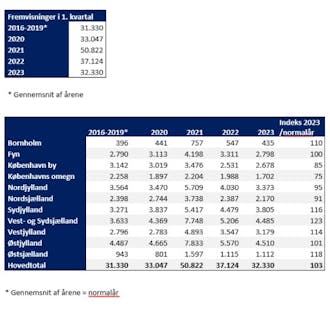 Hos EDC har man således på årets første 3 måneder åbnet hoveddøren til salgsklare boliger 32.330 gange. I forhold til det foregående kvartal, altså 4. kvartal 2022, er der tale om en fremgang på hele 51 pct. Sammenlignes der i stedet med 1. kvartal i et normalt år, er tallet på linje hermed, idet EDC kan notere 3 pct. flere fremvisninger i år end i et normalår.