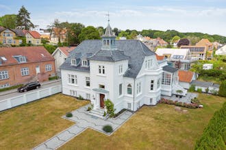 I den mere fredsommelige afdeling kan du lige nu købe en ret skøn palævilla med masser af plads (356 m² + kælder), skov og strand som naboer - og eget tårn med et værelse, der har udsigt til både øst, vest og syd. Og nu du er til vejrs, er der både udsigtsaltan og en stor tagterrasse.