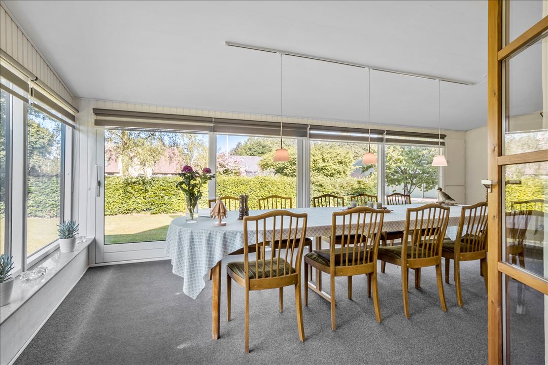 Tilbage i stueetagen træder du ind i den store opholdsstue med brændeovn. Dertil adgang til god udestue, hvor aftensolen kan nydes og større familiekomsammener kan holdes.
